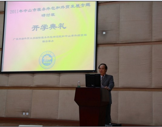 11月21日上午9点,2011年中山市服务外包和外贸发展专题研讨班开学典礼在南校图书馆多功能厅举行。出席此次典礼的嘉宾有中山市外经贸局副局长梁汉熙、我校副校长顾也力、国际服务外包研究院副院长黄立军等。开学典礼由黄立军主持。本次研讨班的学员包括来中山市外经贸局中层领导干部、镇区外经办负责人、重点服务外包企业和外贸企业负责人以及有关商协会负责人。