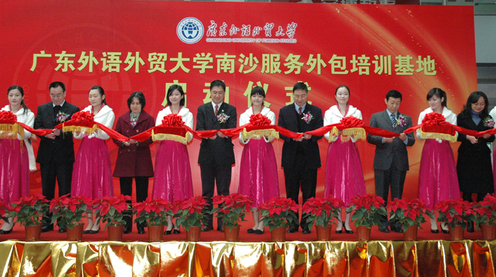 1月12日上午,广外南沙服务外包培训基地启动仪式在南沙资讯科技园培训会议中心举行。出席的嘉宾有我校党委书记隋广军、广州市南沙开发区管委会副主任孙雷、我校党委副书记许国彬、副校长顾也力,广州市对外贸易经济合作局副局长陈泳芳,广州市南沙开发区经济贸易局副局长阮晓红,广州服务外包行业协会会长孟霖等。一些企业界精英、兄弟院校同仁、新闻媒体记者以及我校相关职能部处、二级学院领导等参加了启动仪式。仪式由我校新闻与传播学院播音主持专业王蕙仪、郭宇超同学主持。