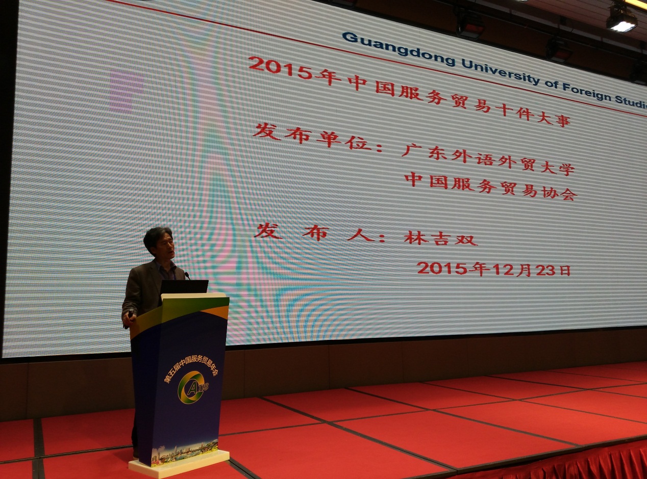 我校国际服务经济研究院院长林吉双作为中国服务贸易协会专家委员会委员,在大会上发布了“2015年中国服务贸易十大新闻事件”,并对这十大新闻事件进行了深入的解读。他认为,对中国服务贸易来说,2015年是具有里程碑意义的一年;在这一年里,中国政府将发展服务贸易、签署双边和多边自由贸易协定上升为国家战略,积极筹建亚洲基础设施投资银行、金砖国家新开发银行等国际金融服务组织,签署中韩、中澳自贸协定和中国--东盟自由贸易升级版,成功推动IMF将人民币纳入SDR货币蓝子,切实推进粤港澳基本实现服务贸易一体化等等;构建了中国参与全球经济治理的组织和平台体系,提升了中国在世界的影响力和话语权。林吉双老师切情入理的分析,得到了与会学界专家与企业代表的一直认可和高度好评。