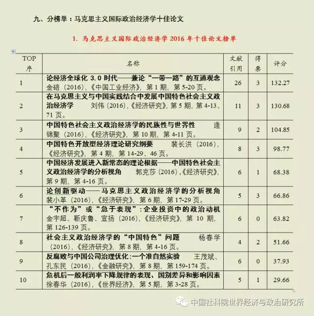 近日,我院徐春华博士发表在《世界经济》2016年第5期的“危机后一般利润率下降规律的表现、国别差异和影响因素”一文经过投票环节和引用情况统计,入选“世界经济学十佳(TOP10)论文榜单中马克思主义国际政治经济学十佳论文”。